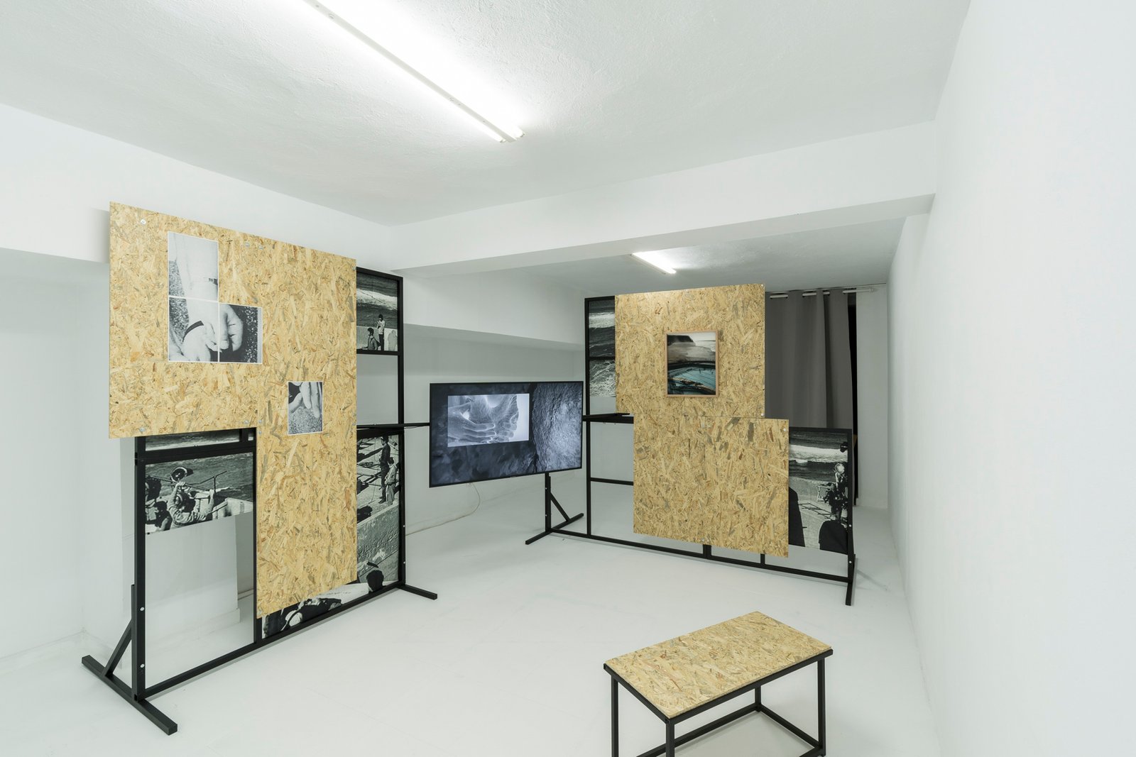 The video installation The Need to Have Walls consists of a large structure that supports a series of images referencing the places where Wenders’ film was shot. The video, through a fictional narrative, references my personal experience in Lisbon: the attempt to reach the seaside hotel, the expectation of a swimming pool, the encounter with a green lake and a series of statues.